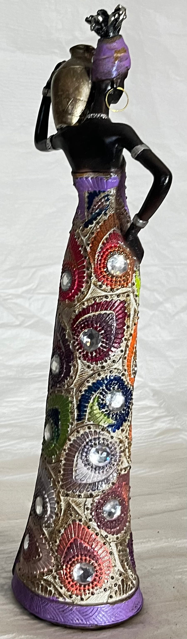 African Lady dressed in a colorful gown with glass stones colorful headdress and water jug